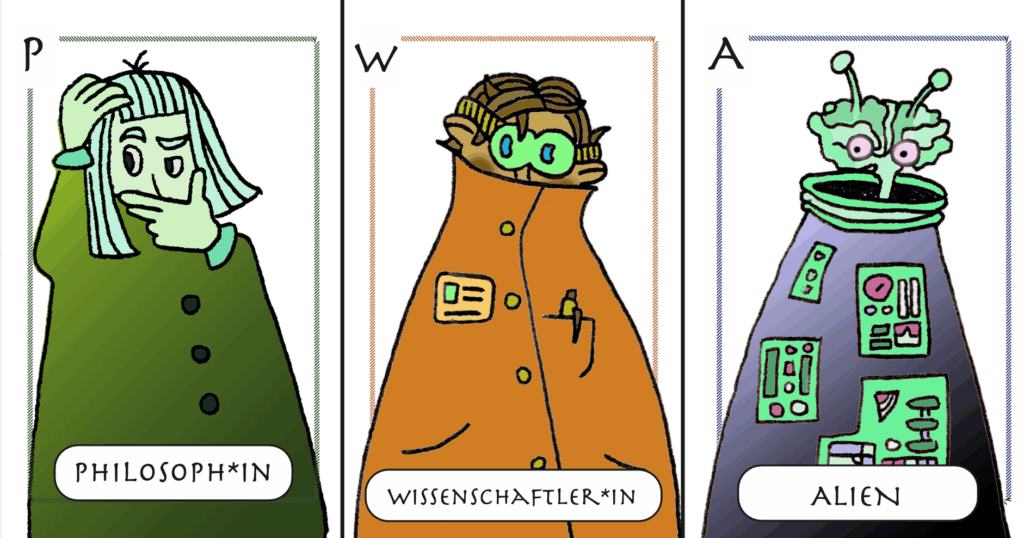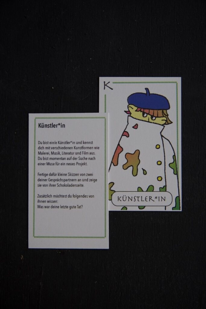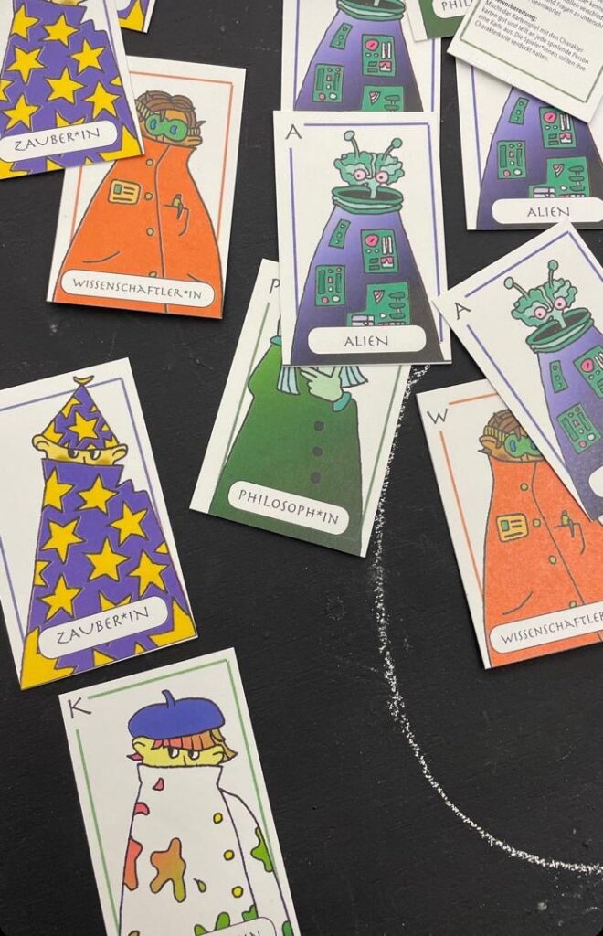 Das Kartenspiel umfasst insgesamt sieben Karten sowie eine Spielanleitung, die dem Spiel einen Rahmen zur Orientierung dient. Auf der Frontseite der Karte ist jeweils eine Figur abgebildet, die optisch verschiedene ‚berufliche’ Rollen zeigt: Es gibt Dichter*innen, Zauber*innen, Pirat*innen, Philosoph*innen, Wissenschaftler*innen, Künstler*innen und das Alien.