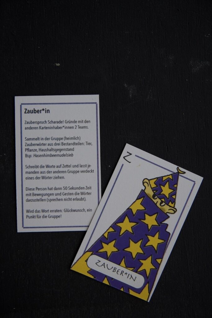 Die Aufgaben verfolgen das Ziel, entweder den Wissensaustausch zwischen den Spieler*innen zu fördern oder sie zu einer kleinen Herausforderung zu ermutigen, die sie aus ihrer Komfortzone führt und Gelegenheit bietet, sich dem Gegenüber auf persönliche Weise zu öffnen. Ein Beispiel dafür ist die Figurenkarte der Dichter*in, die die Spieler*innen einlädt, in Form eines Gedichts über einen Gegenstand aus der Hosentasche der Spieler*in zu verfassen.